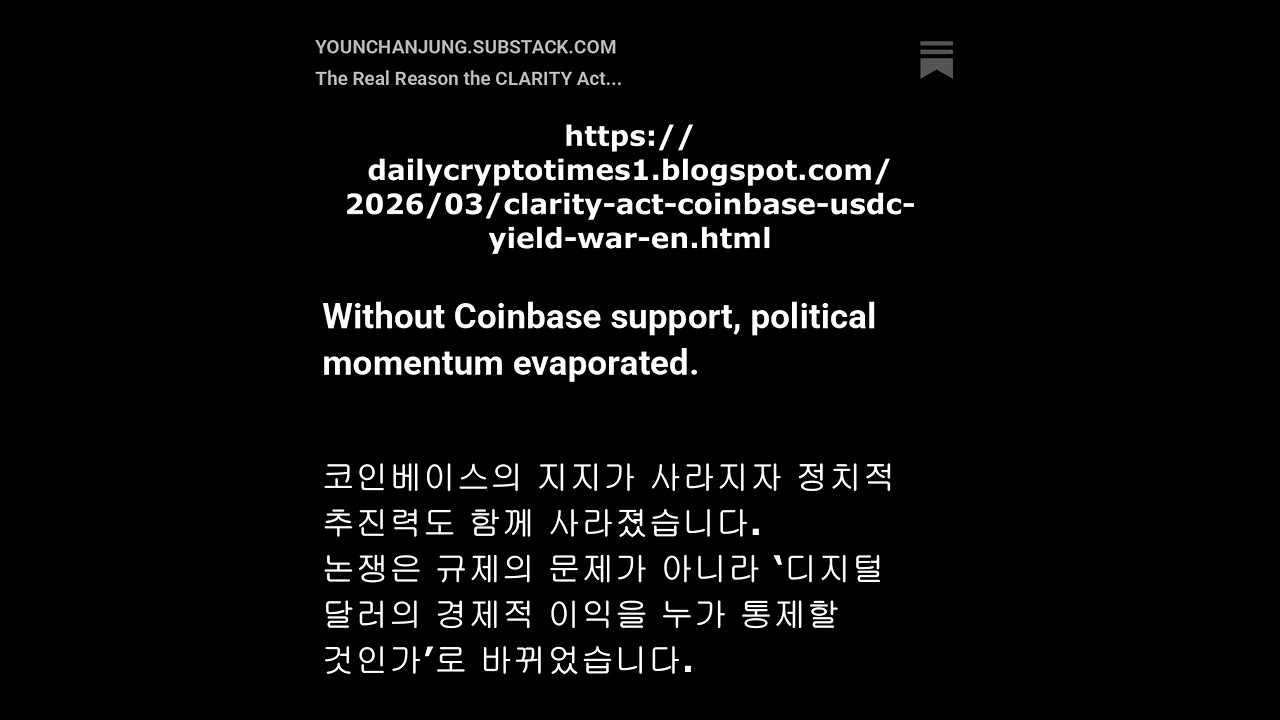 이 때문에 Coinbase는 상원에 “현 상태로는 지지할 수 없다”는 입장을 전달했고, 법안 추진 동력은 급격히 약화되었습니다.