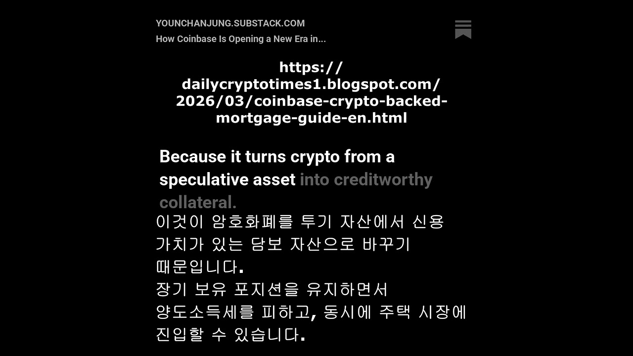 - Coinbase의 ‘크립토 담보 모기지’는 암호자산을 실물 금융과 직접 연결하는 첫 제도권 상품이다.