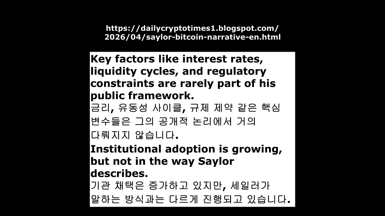 투자자와 독자는 이 두 가지를 분리해서 볼 필요가 있습니다. Saylor의 내러티브는 참고하되, 그대로 믿기보다는 데이터, 제도, 리스크를 함께 고려하는 냉정한 관점이 필요합니다. 그 지점이 바로 Daily Crypto Times가 지향하는 분석의 자리이기도 합니다.